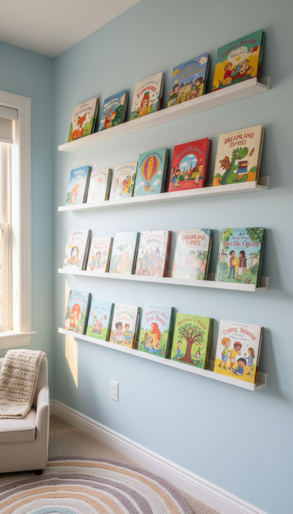 Bookshelves can be deep and intrusive. Floating picture ledges, however, have a very slim profile. By installing them on an empty wall, you can display books with their covers facing out. This saves space and turns the book covers into vibrant wall art, encouraging your child to read more often.