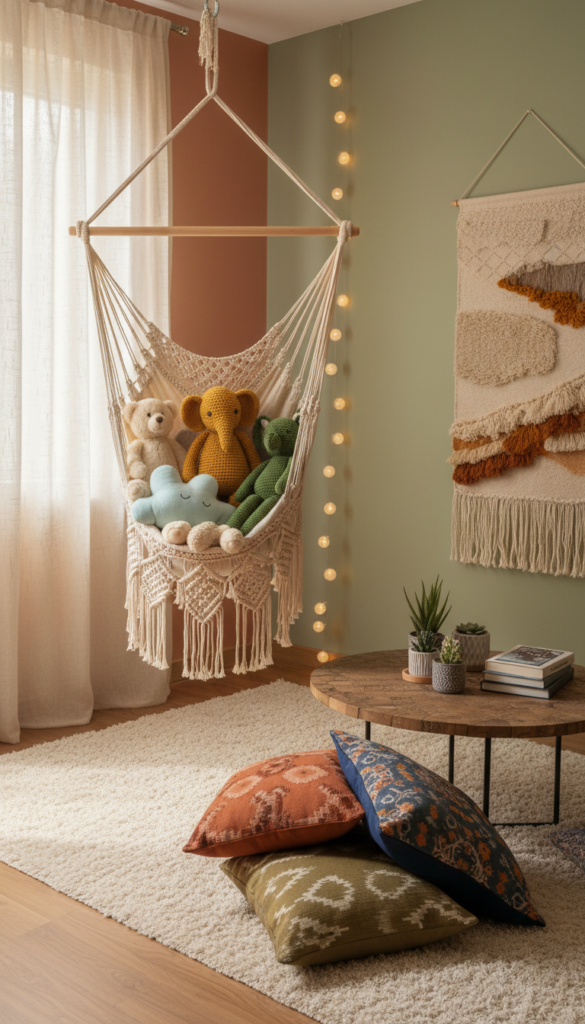Stuffed animals are bulky and difficult to organize. A bohemian-style macramé hammock hung in a corner adds a soft, textural element to the decor while getting plushies off the bed and floor. It turns a collection of teddy bears into a cute, suspended display.