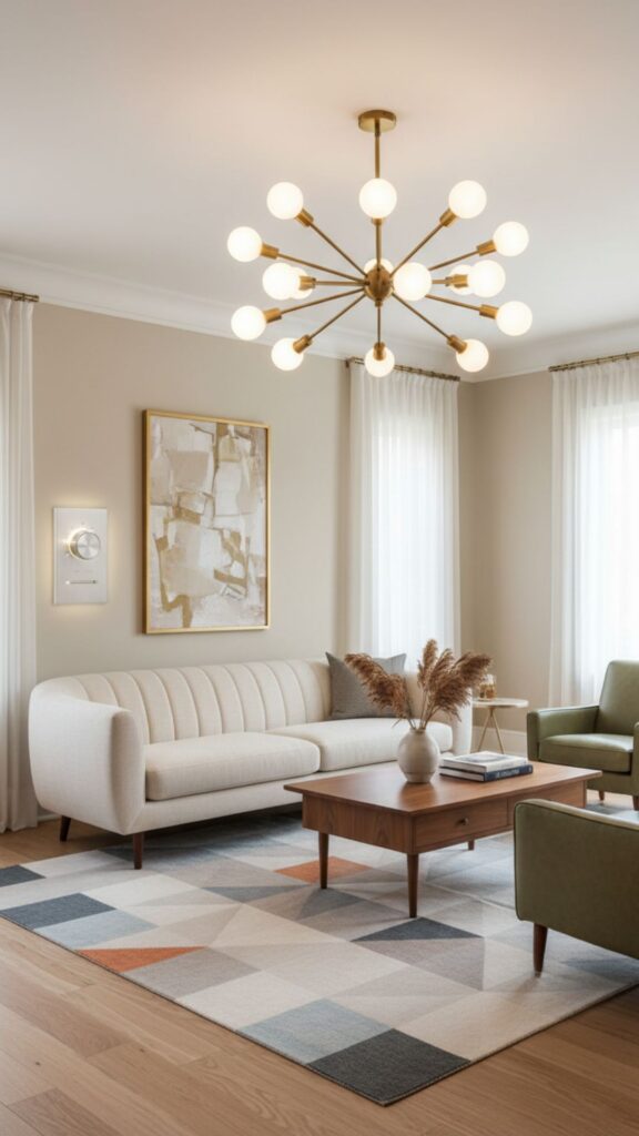 For living rooms that need a focal point, the Sputnik chandelier is a mid-century modern classic. Its starburst design draws the eye upward and distributes light evenly across the room.