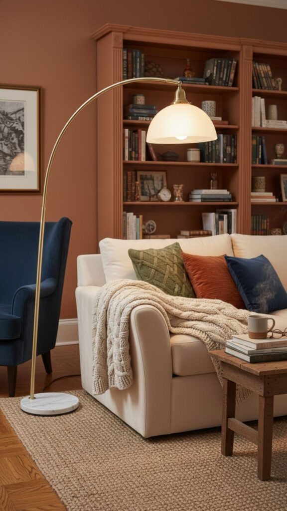 An arc floor lamp creates a cozy reading nook in a living room without requiring ceiling wiring. The long, curved neck allows the light to hang directly over a sofa or armchair.