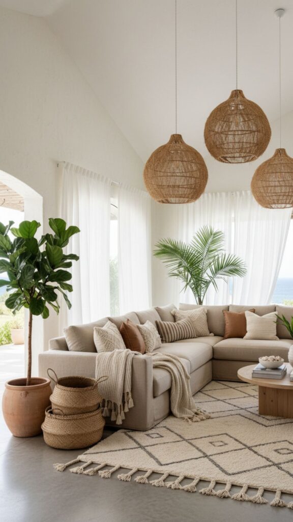 For a bohemian or coastal vibe, natural textures are essential. Woven rattan or seagrass light fixtures bring warmth and an organic element to kitchen dining areas or living rooms.
