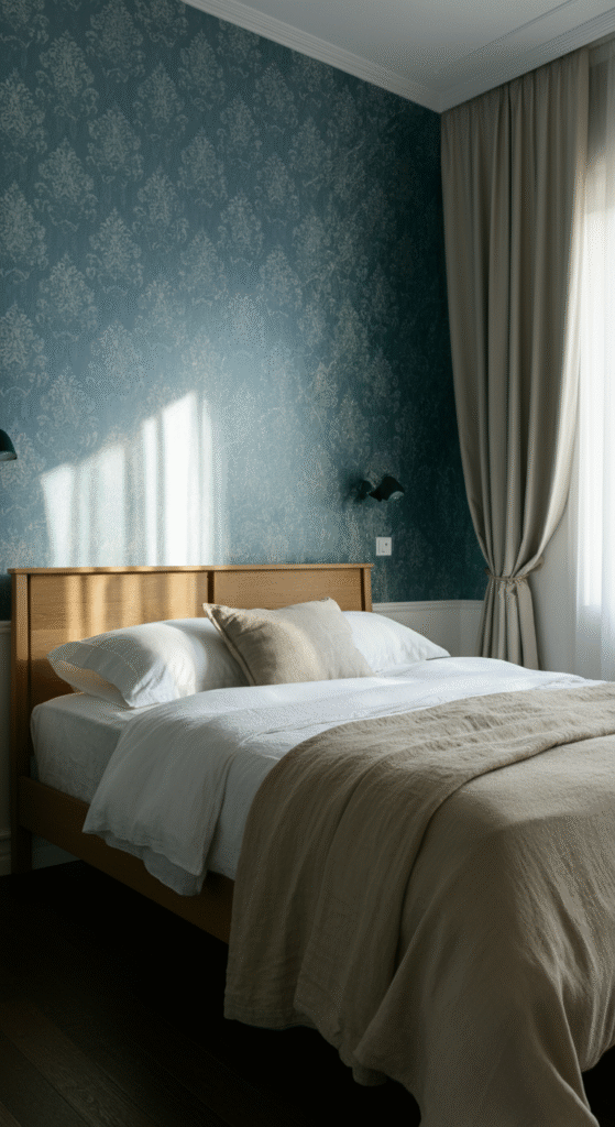 Older homes used wallpapers a lot because they wanted stories on the walls. And honestly, that little texture instantly adds timelessness. If you choose subtle colors like muted blue, beige, or sage, your bedroom starts looking like a picture from an old classic magazine.