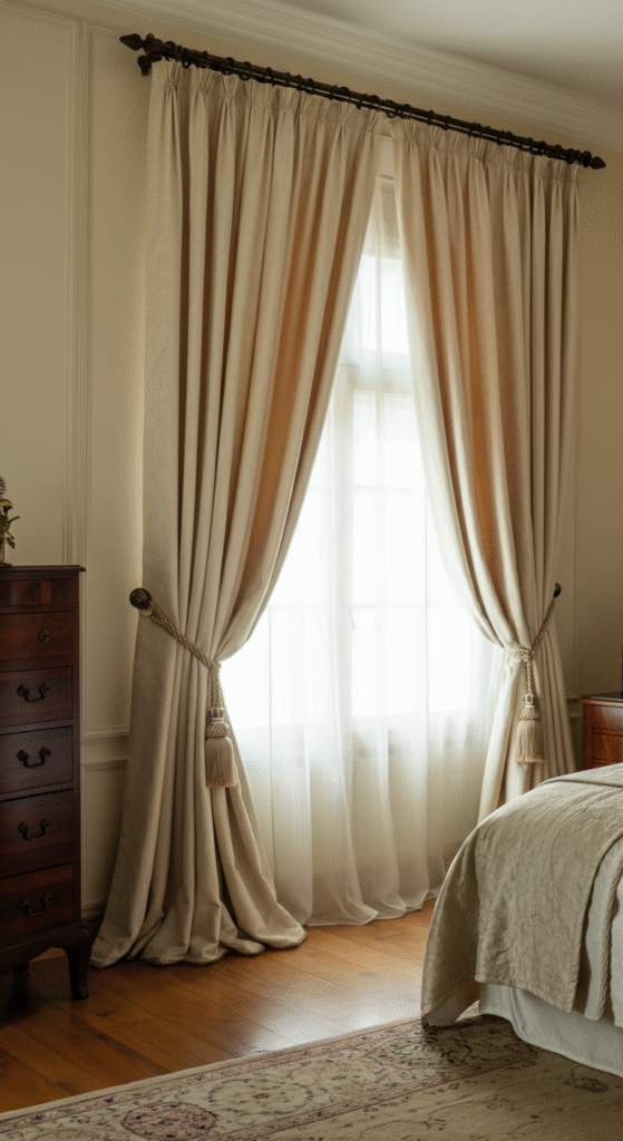 Linen, velvet, cotton blends, or lightly embroidered fabrics all work nicely. And when you tie them back using a rope tassel or metal hook, the room gets that classic hotel look.