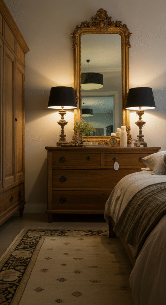 Mirrors with gold or bronze frames instantly lift a traditional bedroom. They reflect light, make the room feel open, and give that old world sparkle. Antique mirror designs often have floral edges, curved frames, or hand crafted details.