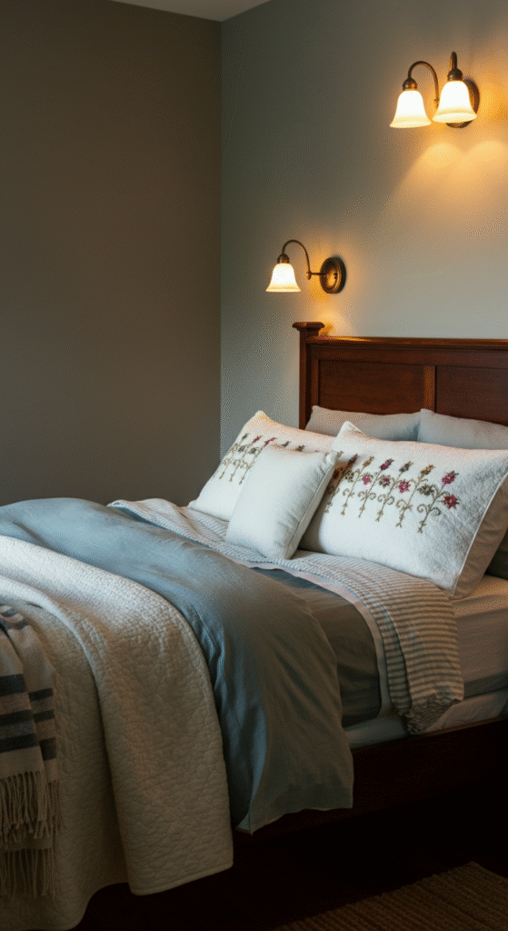Table lamps with fabric shades are also a classic. You can place one on each nightstand for balance. The light spreads softly across the room and makes it feel timeless.