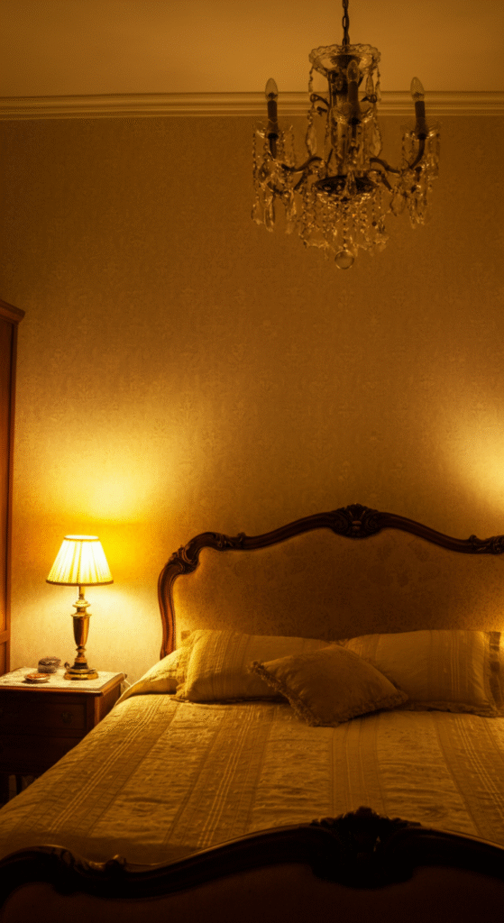 Lighting changes the mood of a traditional bedroom completely. Instead of white harsh lights, choose warm soft yellow ones. Chandeliers with crystals or curved iron frames are great for ceilings.