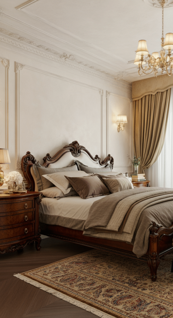 Traditional bedrooms have a special quality that never goes out of style. They mix comfort, elegance, and nostalgia in a very natural way. Whether it is carved wood, soft wallpaper, antique mirrors, or neutral colors, each element works together to create a space that feels peaceful and meaningful.