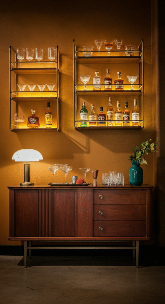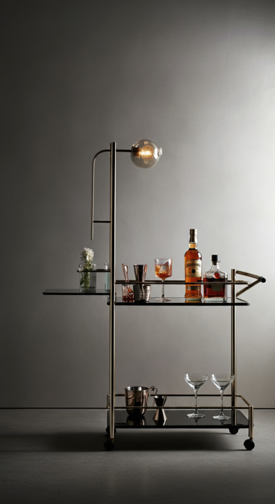 Think art deco-inspired bar carts, sleek glass shelves, and chic accessories that make a statement.