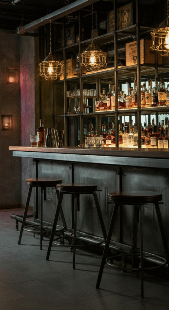 If you love an edgy, urban look, an industrial-style bar could be your ideal choice. With exposed metal, distressed wood, and raw finishes, industrial bars bring a bold and rugged aesthetic to your living room.