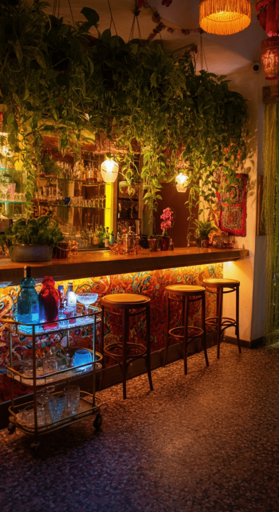 For those who crave a laid-back, eclectic vibe, the bohemian bar style is the perfect option. With a mix of colorful patterns, vintage furniture, and worldly influences, boho bars create a free-spirited atmosphere that invites creativity.
