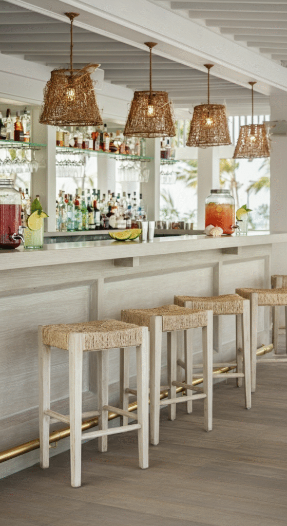 For a relaxed, beachy vibe, a coastal-inspired bar is the perfect way to bring the ocean’s tranquility into your living room. Light, airy furniture paired with nautical accents, such as blue hues, seashells, and driftwood, can create the perfect coastal bar. This style is all about creating a peaceful, laid-back atmosphere that makes you feel like you’re on vacation every day.
