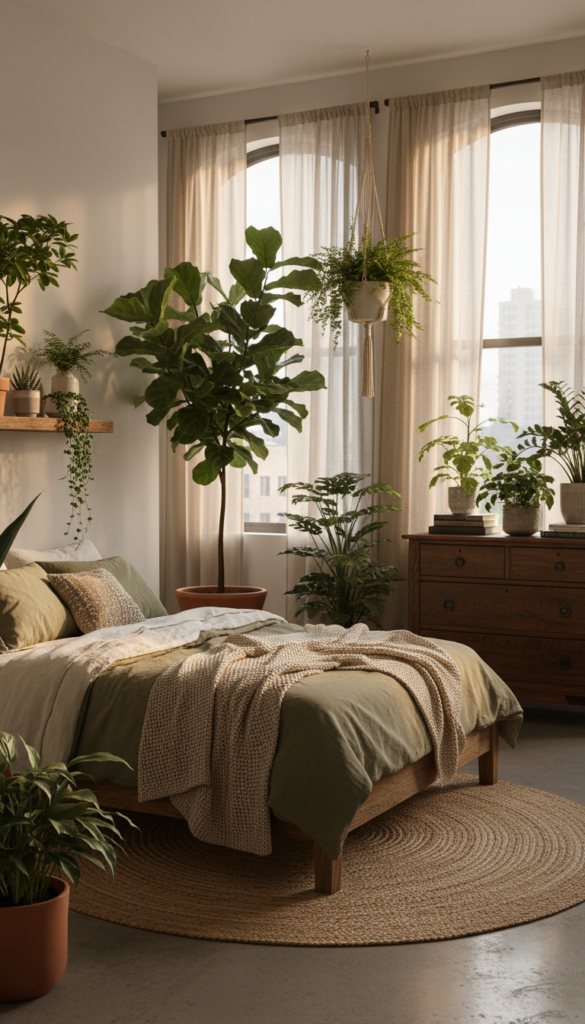 Succulents, ferns, and small indoor trees work well in an urban jungle aesthetic. They add greenery without overwhelming the space, and their earthy tones complement the industrial and modern elements.