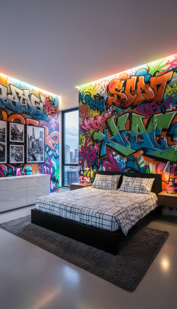 If you’re someone who loves the vibrancy of street art, incorporating graffiti into your bedroom can add an edgy, urban flair. Think colorful murals or custom artwork that reflect the energy of city life.