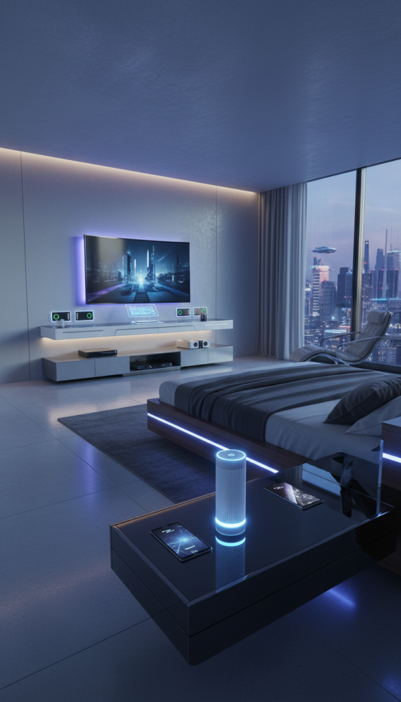 You can add tech-inspired elements like smart lighting, voice-controlled assistants, and high-tech furniture. These items make your bedroom more functional while enhancing the modern city living vibe.
