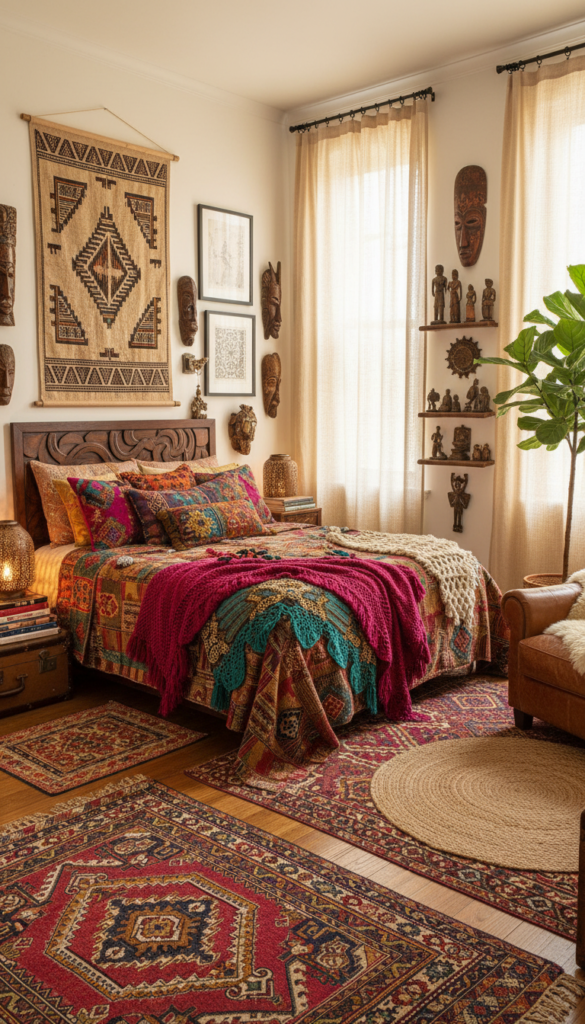 Incorporate items like woven rugs, travel souvenirs, ethnic prints, and vintage accessories. Add layers of textures and rich colors to create a cozy, eclectic vibe. This style celebrates freedom, creativity, and the spirit of adventure, making your room feel like a personal sanctuary.