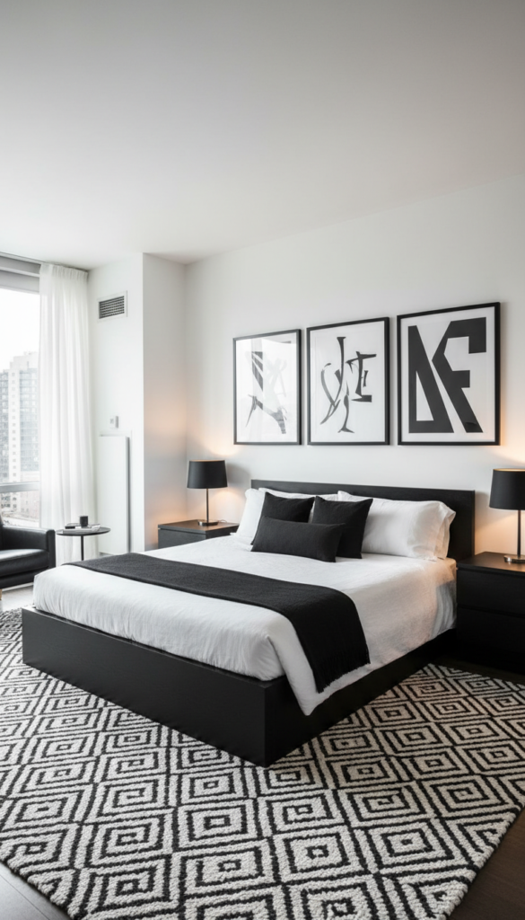 Black and white can be used in many ways, from minimalistic geometric patterns to artistic prints. It’s the perfect backdrop for pops of color through accessories like throw pillows, lamps, or artwork.