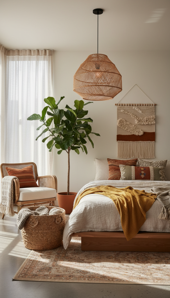 It is often described as “boho-chic,” “eclectic,” or “modern bohemian.” It blends vintage elements, global patterns, natural materials like rattan and wood, and a relaxed, lived-in vibe.