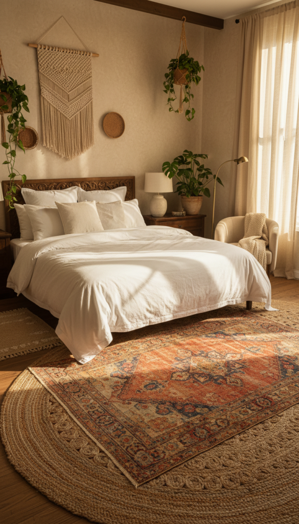 Absolutely. The boho aesthetic thrives on imperfection. Mixing light woods (like bamboo or rattan) with darker woods (like walnut mid-century pieces) adds character and prevents the room from looking too “matchy-matchy.”