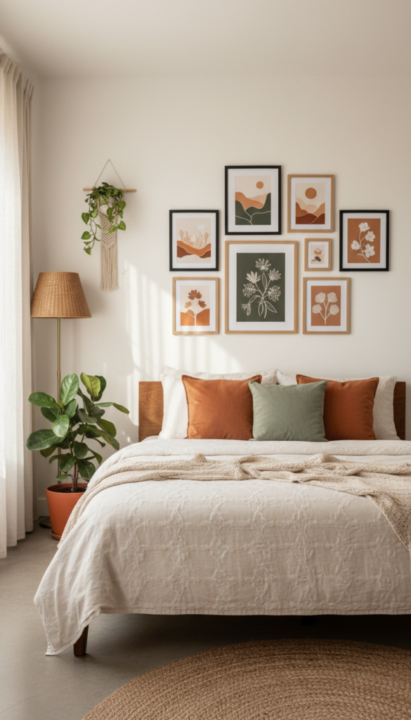 A gallery wall is the ultimate way to inject personality into your space. The trick to making it look expensive rather than cluttered is curation. Mix different sizes of frames and alternate between art prints, personal photos, and even 3D objects like wall planters or macramé.