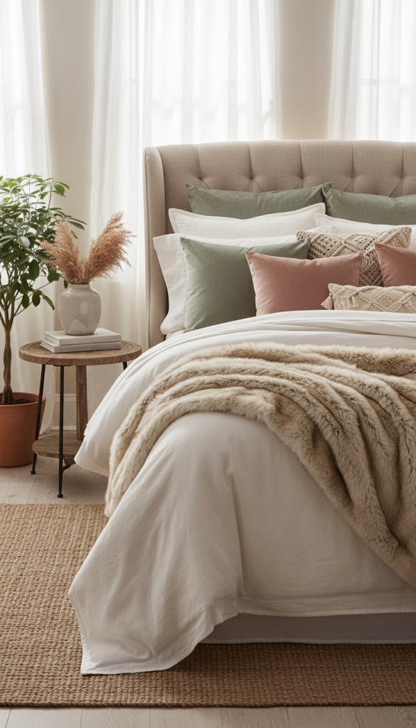 Layering luxuriously soft textures is a surefire way to elevate your bedding. A velvet throw pillow or a faux fur blanket at the foot of the bed adds richness and depth. These textiles catch the light beautifully and scream “expensive comfort.”