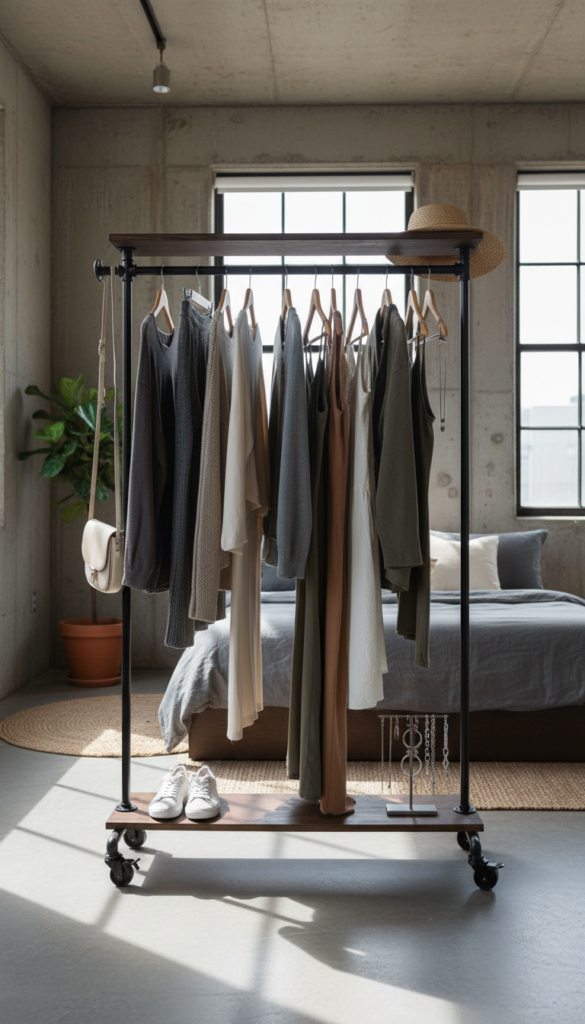 If your closet is overflowing (or non-existent), turn your clothes into decor. An exposed metal clothing rack isn’t just functional storage; it’s a style statement. It gives off that “backstage at a fashion show” energy that feels intentional and cool.