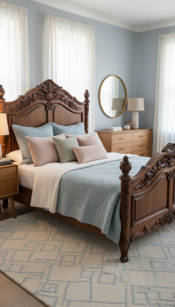 Combine vintage pieces like a retro bed frame or antique lighting with modern elements. Balance the old and new by using neutral tones and minimalist modern furniture alongside vintage accents like rugs and mirrors.
