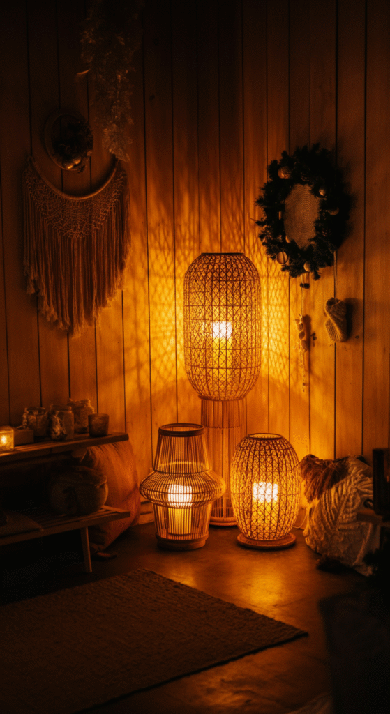 Woven lanterns are the backbone of boho lighting. Their imperfect patterns create soft shadows and warm pockets of light that instantly make a room feel grounded.