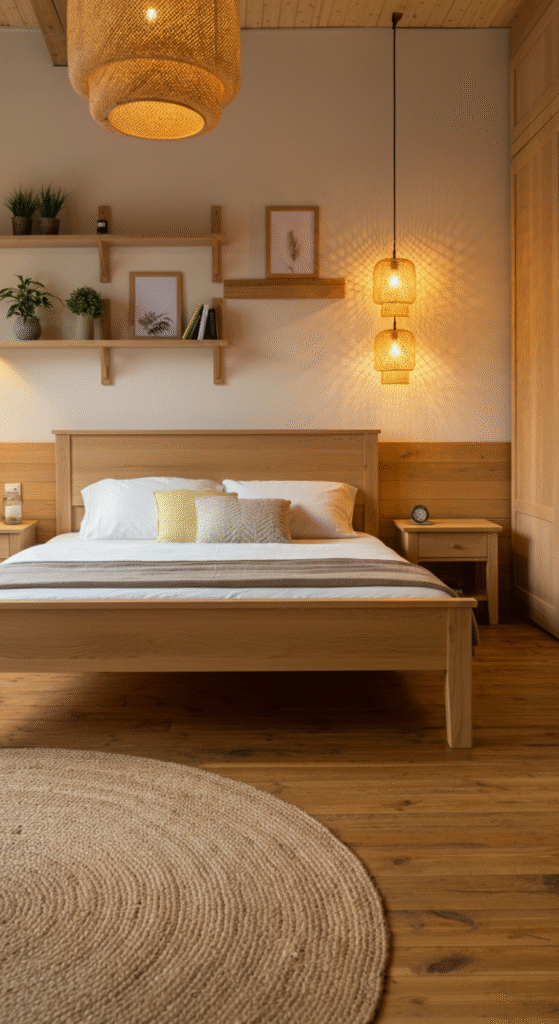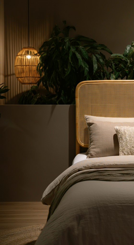 Textures like linen, cotton, jute, and wool can help soften the overall aesthetic of your bedroom while bringing an organic feel to the space. Linen bedding, for example, has a breezy, earthy quality that enhances the “outdoor” vibe you’re aiming for. Woven jute rugs add texture to the floor, and wicker or rattan furniture brings a rustic touch to the room.