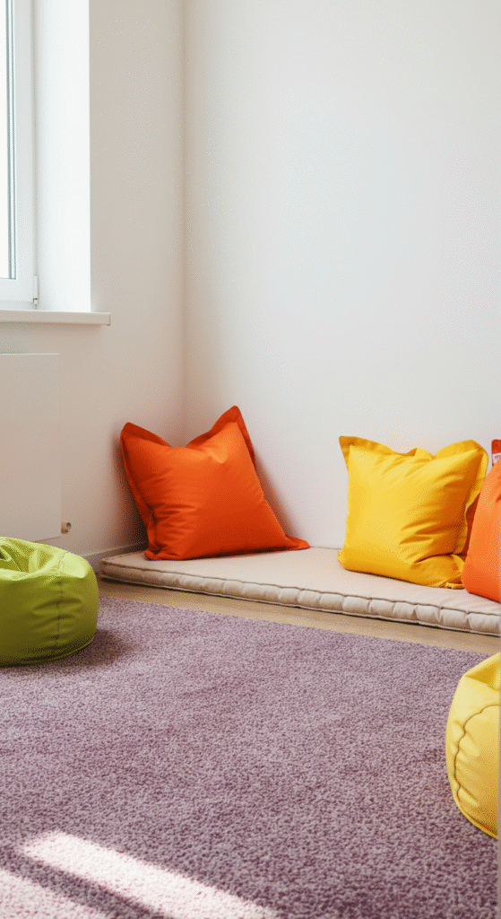 To make a kids’ corner stand out, define the area using rugs and floor cushions. A soft rug with vibrant colors or playful patterns creates a comfortable space for kids to play on the floor, while floor cushions or bean bags add extra seating and coziness.