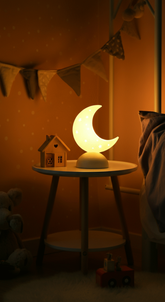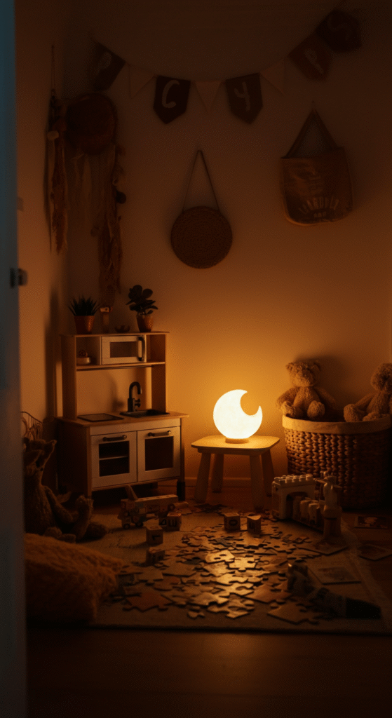 Lighting can dramatically impact the feel of a space, especially in a cozy corner. Soft, warm lighting is perfect for setting a comfortable mood. Consider adding a decorative lamp with soft lighting or a string of fairy lights to bring warmth and a whimsical atmosphere to the kids’ corner.