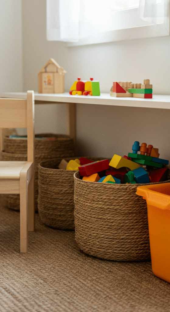 To avoid toys taking over the room, add stylish baskets or storage cubes that are easy for kids to access. These can store everything from toys to craft supplies, while still looking neat and tidy. When the toys aren’t being played with, they’re easily tucked away, making your living room feel less cluttered.