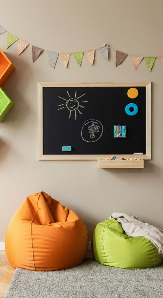 Add an interactive element to the kids’ corner by hanging a chalkboard or installing a magnetic wall. Not only is this a fun way to encourage creativity, but it also provides an easy way for kids to express themselves through drawing and writing.