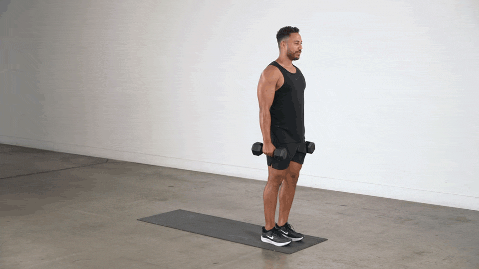 - Stand with feet hip-width apart, dumbbells in front of thighs.