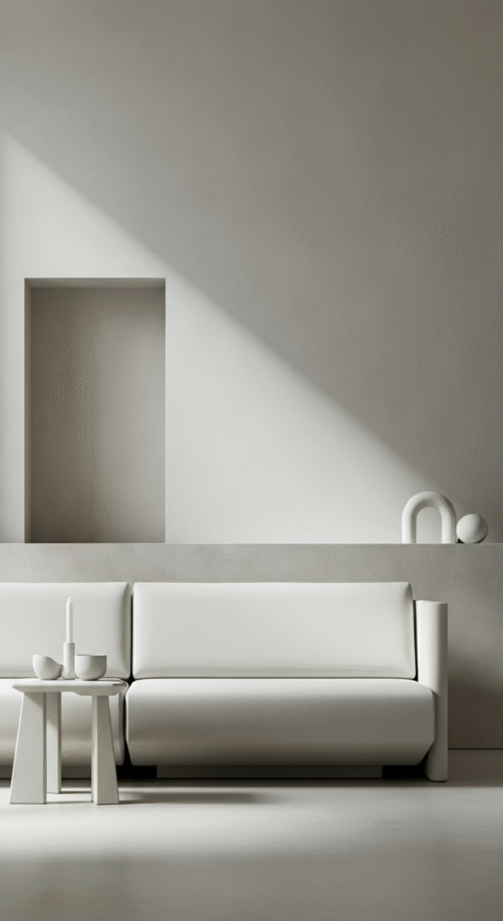 A low-profile sofa, a small coffee table, and a few carefully selected decorative elements like a vase or abstract art piece are the hallmark of this design.
