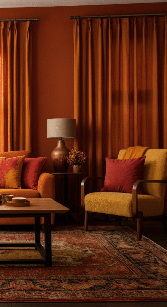 For a fall-inspired living room, earthy tones like burnt orange, mustard yellow, deep reds, and browns work beautifully. You can also incorporate shades of green, such as olive or moss, to create a balanced and warm atmosphere.