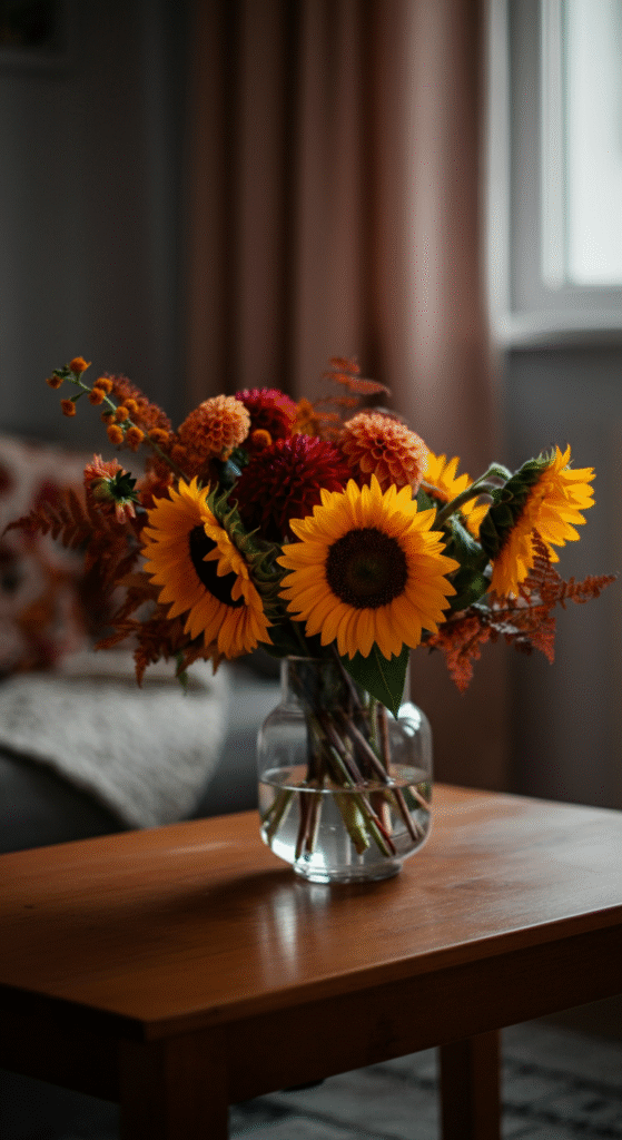 Fresh or faux floral arrangements can add life and a touch of elegance to your fall décor. Think of bouquets with sunflowers, chrysanthemums, and dahlias, which are all abundant in fall. For a more rustic touch, consider a mix of wildflowers or dried florals arranged in a simple glass vase.