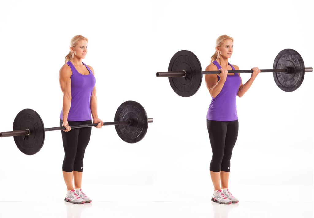- Stand tall, and grip the barbell with palms facing up (shoulder-width).