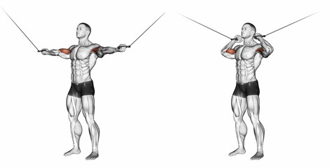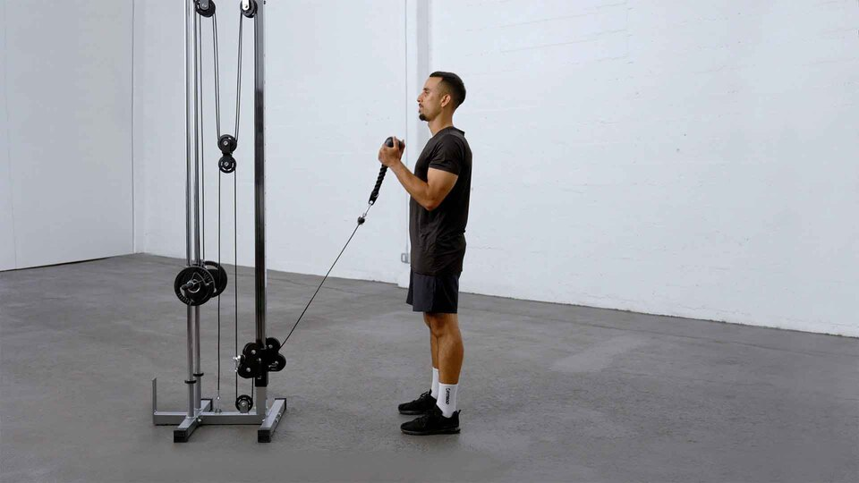 - Hold both handles, step forward, and raise elbows to shoulder height.