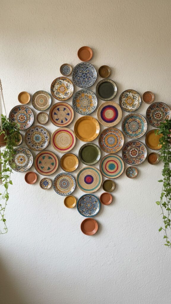 Forget grandma’s china cabinet—hanging plates on the wall is a classic boho move that adds incredible dimension and pattern.