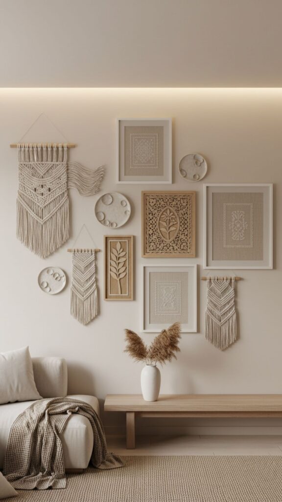 - Combine 3D art like fabric hangings or wood carvings with standard prints.