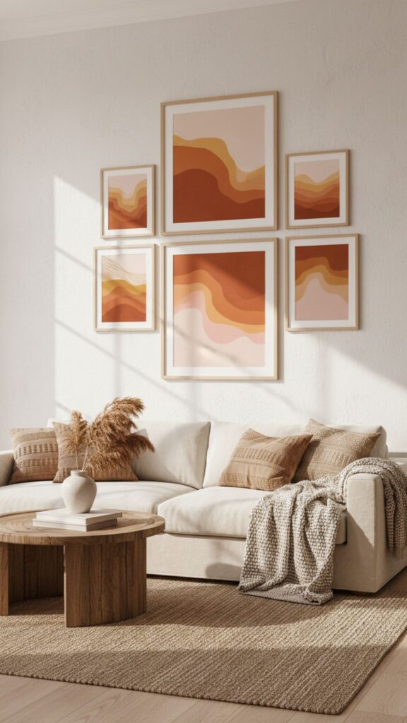 Create a cozy atmosphere by choosing art in a specific warm color palette: terracotta, mustard yellow, burnt orange, and dusty pink.