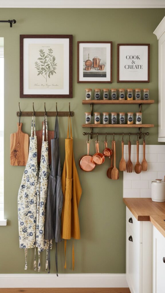 - Intersperse framed art with hooks for hanging aprons, dried herbs, or cutting boards.