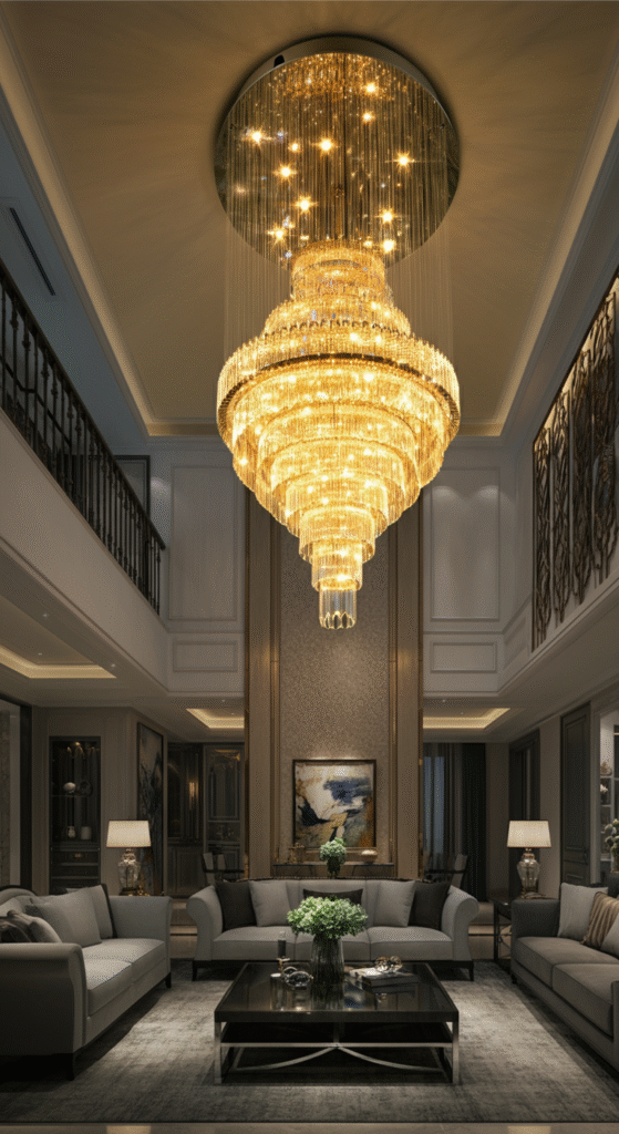 A large, eye-catching chandelier or modern pendant lights work beautifully in living rooms with high ceilings. They create a dramatic effect while adding sophistication.
