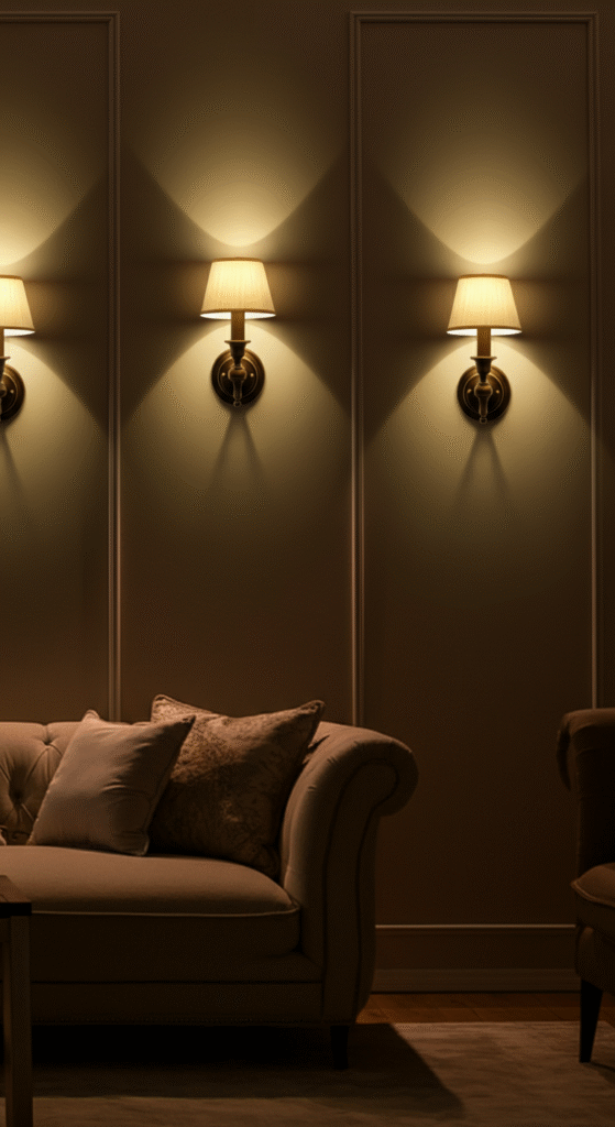 Wall sconces are a perfect way to introduce both vertical light and a subtle glow into your living room. These fixtures can be placed on either side of a focal point, such as a fireplace, mirror, or piece of artwork. Wall sconces provide soft, ambient light that can make a room feel warm and inviting without being overwhelming.
