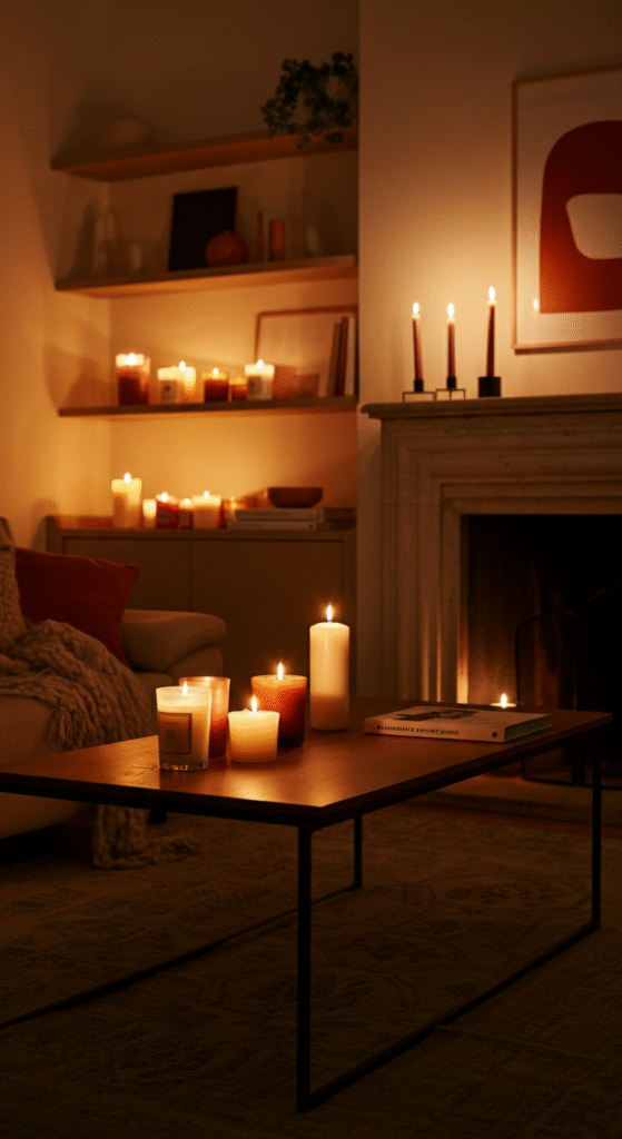 You can use candles to highlight specific areas in the room, such as a mantelpiece or coffee table. Try using a mix of pillar candles, tea lights, and decorative candle holders to add depth and dimension to your space.