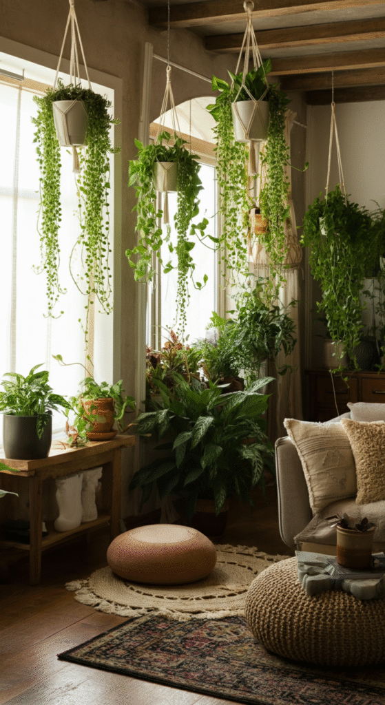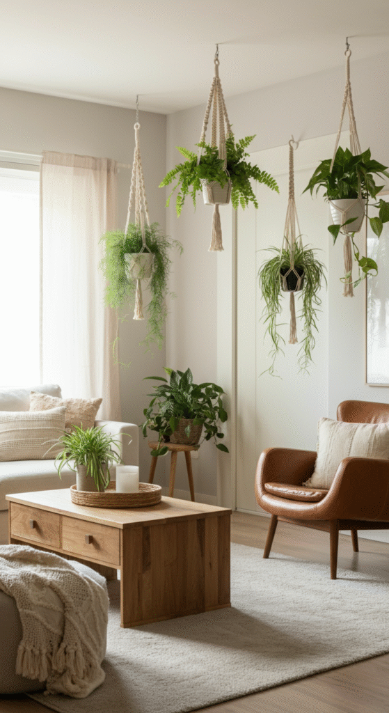 Do you know that hanging plants are a great way to maximize floor space while also drawing the eye upward, making your living room feel taller and more open?