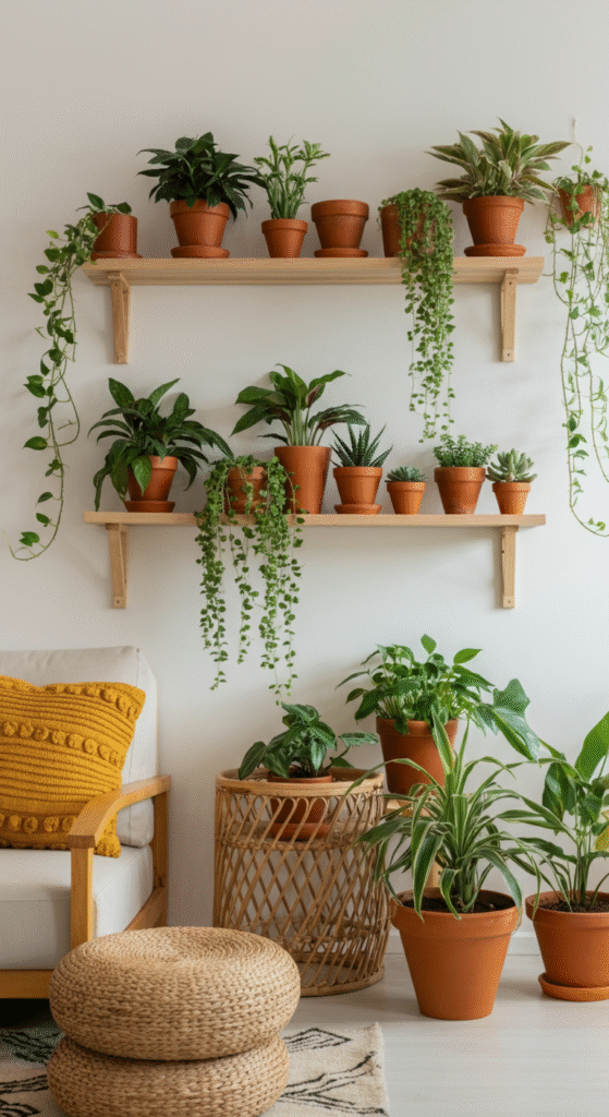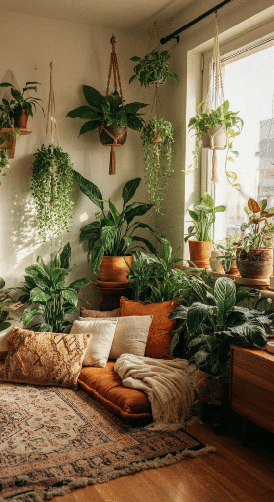Use different heights, textures, and pot styles to create an eclectic mix that feels like a boho retreat. You can even add a comfy chair or a throw blanket for the perfect reading spot surrounded by lush greenery.