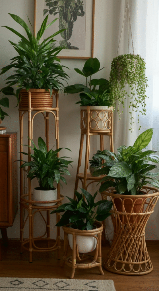 2. Rattan or Wicker Plant Stands: Vintage Vibes