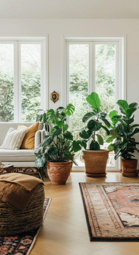 Sometimes, bigger is better. If you have the space, large floor plants are a fantastic way to make a statement and add a dramatic touch to your boho living room. Think tall palms, monstera, or fiddle leaf fig trees—these plants not only purify the air but also create a natural focal point in the room.