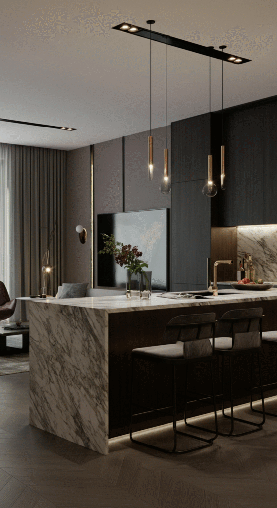 Consider incorporating a statement island that complements the overall design of the living room, such as a marble countertop with bold veining or a wooden finish that ties in with the living room furniture.